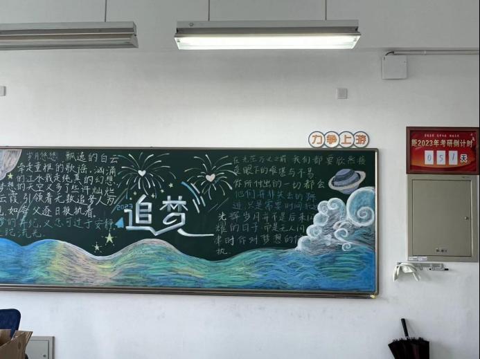 据了解,孙玉婷学姐明天早上大概七点中到达自习室开始备考,一直复习到晚上十点半才回去。每当疲倦的时候,抬头看到了学弟学妹问他们精心设计的黑板报,所有的劳累都一扫而空。