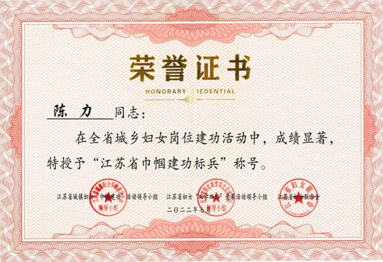 近日,陈力老师被江苏省城镇妇女“巾帼建功活动”领导小组、江苏省妇女“双学双比”竞赛活动领导小组、江苏省妇女联合会联合表彰为“江苏省巾帼建功标兵”称号。
