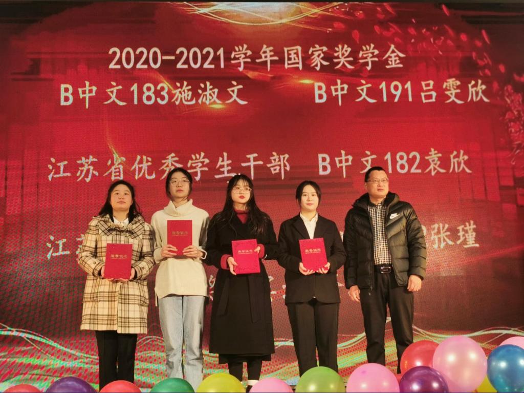 何登溢为“2020-2021学年国家奖学金”、“江苏省优秀员工干部”、“江苏省三好员工”获得者颁奖