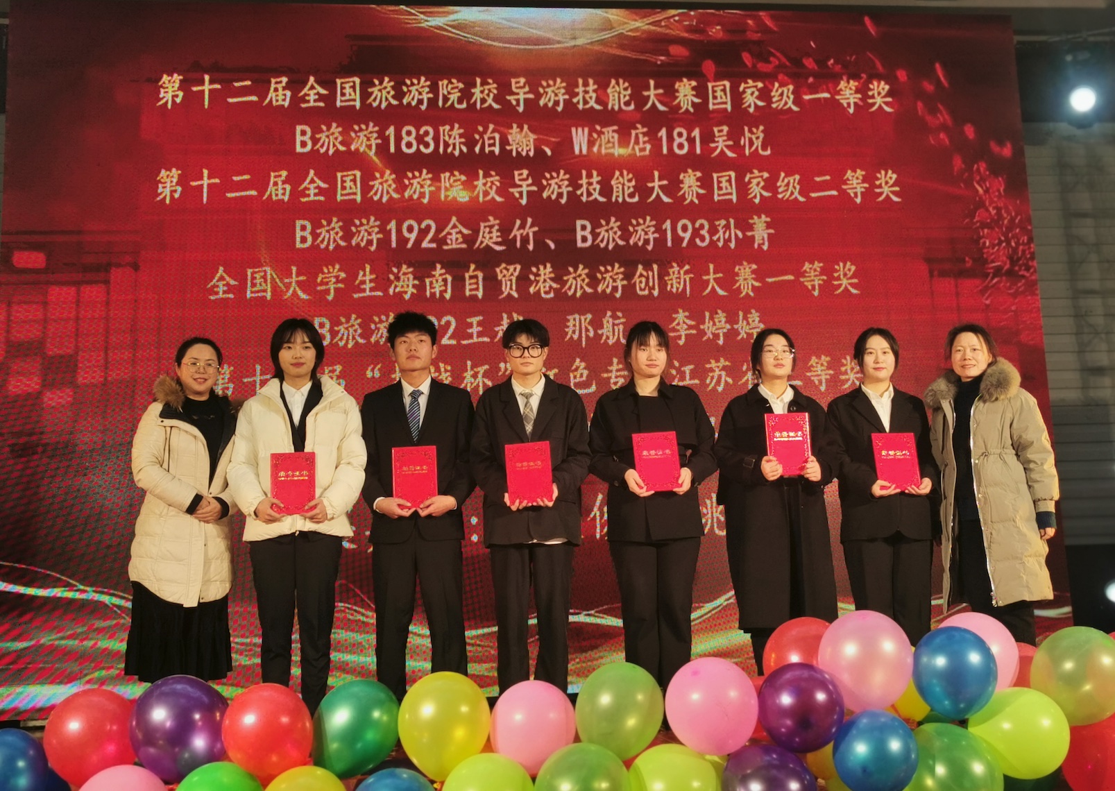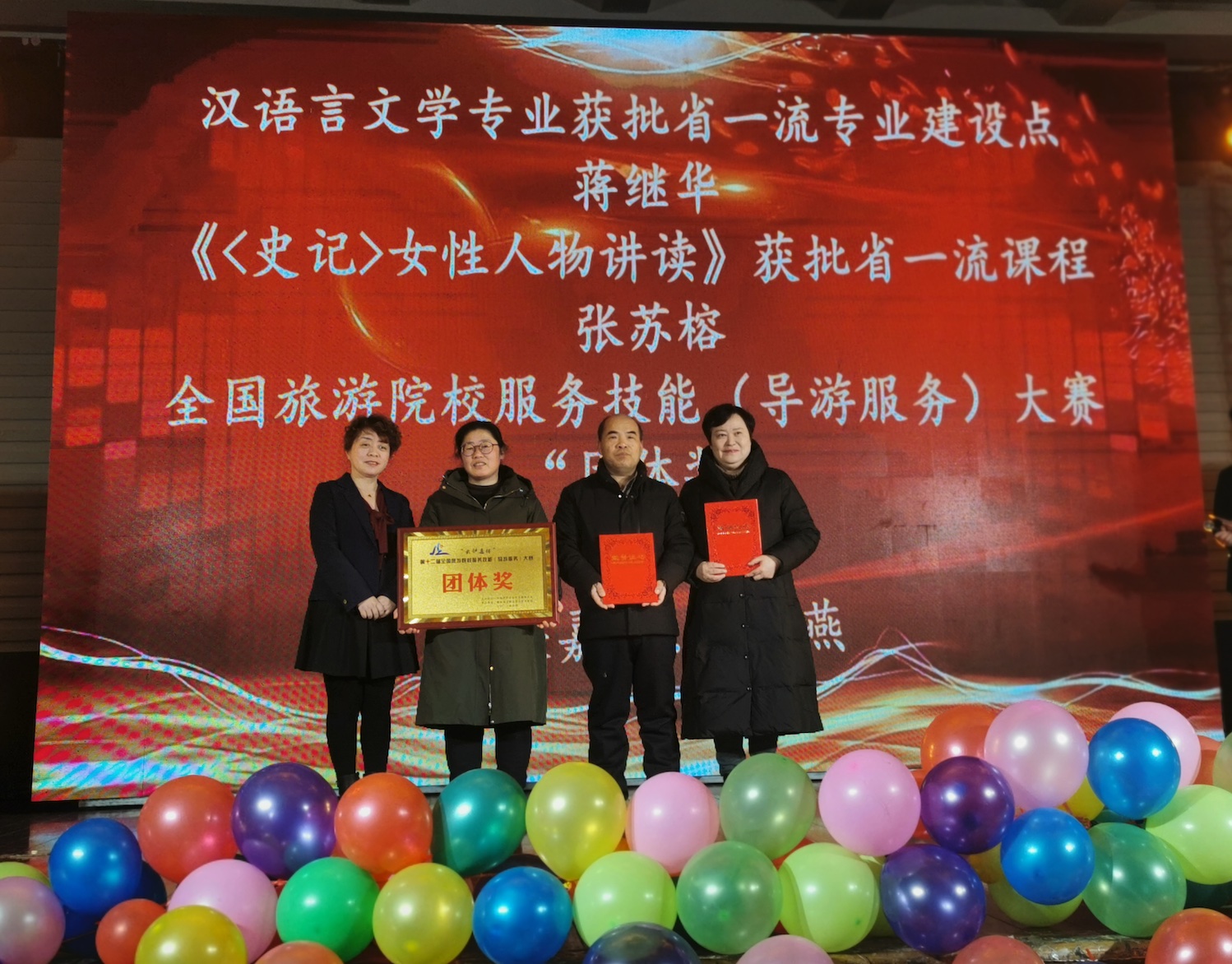 经理周晓燕致辞,她用“fashion”、“high level”和“双一流”三个词对PA视讯官方网站一年来的工作和取得的成绩进行了总结。2021年,PA视讯官方网站在专业建设、学科竞赛、学风建设等方面硕果累累,汉语言文学专业获批省一流专业建设点,张苏榕教授的“《<史记>女性人物讲读》”获批省一流课程,张玉玮老师团队指导的员工获全国旅游院校服务技能(导游服务)大赛一等奖、二等奖及团体奖。B中文183班施淑文和B中文191班吕雯欣两位同学获“2020-2021学年国家奖学金”、B中文181袁欣同学获“江苏省优秀员工干部”荣誉称号,B中文192班张瑾同学获“江苏省三好员工”荣誉称号。院领导分别为获奖的个人和团队颁奖。