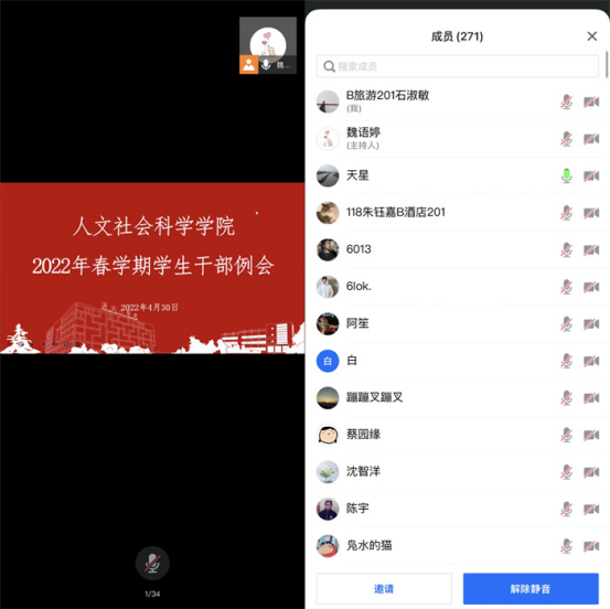邱天星总结近期团委重点工作,他提醒同学务必要做好每一期青年大学习,安排好每周一次的疫情期间执勤工作,做好毕业生党员材料整理。他指出员工干部是桥梁纽带,必须要做到及时把同学的各种动向及心理状况报告给老师,向老师汇报疫情防控期间同学们的诉求,协助老师更好地开展各项工作。