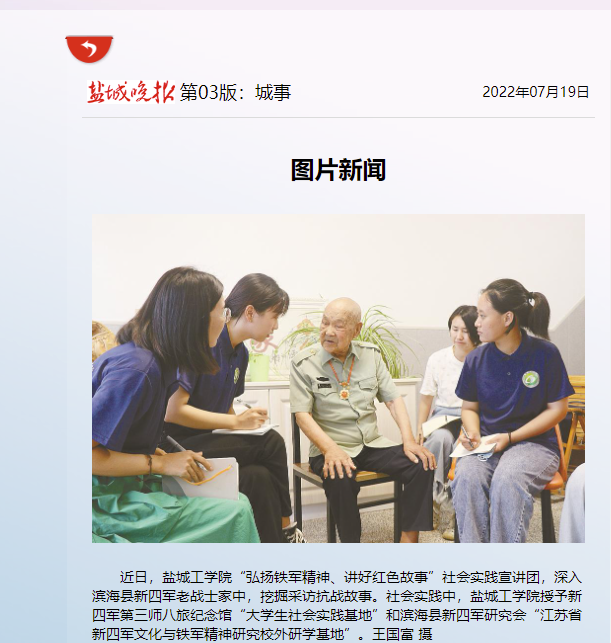 盐城晚报报道公司“弘扬铁军精神、讲好红色故事”社会实践宣讲团
