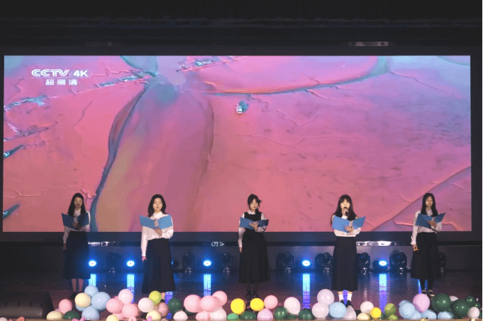 晚会在寻梦乐队带来的歌曲表演《崇拜》中缓缓揭开帷幕。紧接着,王艺菲等同学用饱满热情呈现的集体舞《像你这样的朋友》,脚步轻快、精神昂扬,尽显人文学子朝气蓬勃的青春风貌。麦尔丹和陈嘉怡两位同学以独特的嗓音和细腻的情感表达深情演绎歌曲《罗生门》。田阳等同学用现代幽默诙谐的表演方式,将古装剧经典片段《甄嬛传之滴血验亲》演绎得生动有趣,引得现场观众阵阵笑声。阿迪莱·阿卜杜外力等少数民族同学带来的舞蹈《雪莲花开》典雅优美,仿若一朵朵盛开的纯白雪莲。李羽夕等同学的三人合唱《想你时风起》婉转悠扬,吹起了大家心中的悸动与感怀。张羽嫣等同学演绎的配音秀《小时代之作业划水版》,结合现代热梗,幽默感十足。刘思睿、丁羿丹带来的街舞串烧和艾尚模特社的服装走秀《AI SHANG——Show》青春动感,魅力四射,点燃了全场观众的热情,将晚会推向高潮。邱子涵同学的古筝演奏与钟颖颖、许琰熙两位同学的古典舞相得益彰,将国风歌曲《红马》演绎得如诗如画,令人陶醉。秋雨话剧社以“五四运动”为背景,展演的红色话剧《破晓》,让观众仿佛置身于青年为了国家的尊严和民族的未来,振臂高呼、奋起抗争的觉醒年代。王紫郦等同学带来的原创诗歌朗诵《鹤舞鹿鸣·盐城绿林湿意浓》,用清澈的心灵之声,将盐城黄海湿地的自然美景、生态和谐与生物多样性的独特魅力娓娓道来。24级新生代表们通过《如愿》的歌声传递着青年员工对未来的无限憧憬与坚定信念。