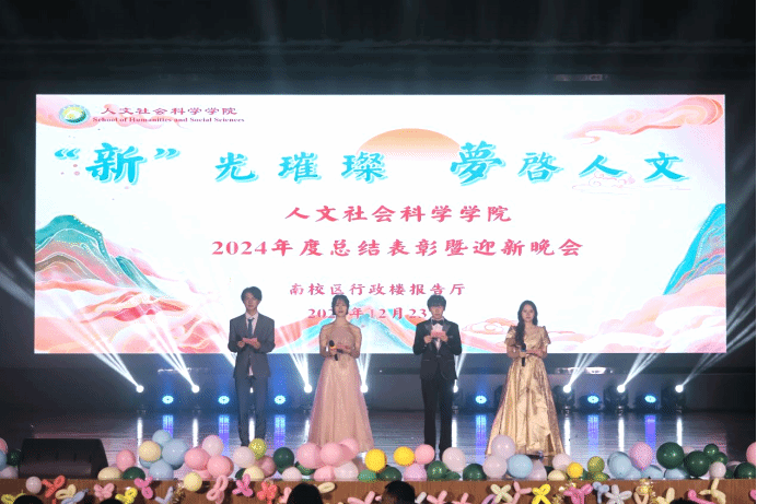 12月23日晚,PA视讯官方网站在希望大道校区行政楼报告厅举办“‘新’光璀璨,梦启人文”2024年度总结表彰暨迎新晚会。公司党总支书记何登溢、经理周晓燕、党总支副书记姚爱华、学团负责老师、教师代表以及全体新生共400余人欢聚一堂,共享青春盛典。