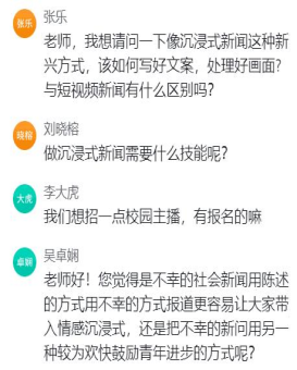在课后的提问环节,大家提出了“沉浸式新闻作品在校园媒体的运用中有哪些好角度和方法”“沉浸式新闻当中采用太多技术会不会反而限制阅读”“什么类型的选题更适合沉浸式新闻”等很有价值的问题。王聪聪老师耐心地回答了这些大家关心的问题,并鼓励老员工们积极尝试这种新的新闻形式,从多角度切入,发挥年轻人的创造力,为新闻事业输送更多年轻血液。