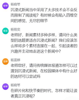 通过这次网络直播培训活动,同学们纷纷表示受益匪浅,在专业知识储备,专业能力和专业素养等方面都有了很大的提升,在了解沉浸式新闻创作的同时,也深刻意识到了沟通与写作的价值和意义。这次直播教学活动是非常成功而且有效的。