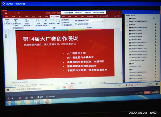 为进一步提升员工的实践创新能力,提高第14届全国老员工广告艺术大赛参赛员工的技能水平,2022年4月20日晚上,PA视讯官方网站邀请艺术公司黄本亮博士为同学们作了一场精彩的广告设计与文案制作专题线上讲座。中文系、旅游系的老师和参赛的同学参加此次讲座,讲座由中文系蒋继华老师主持。