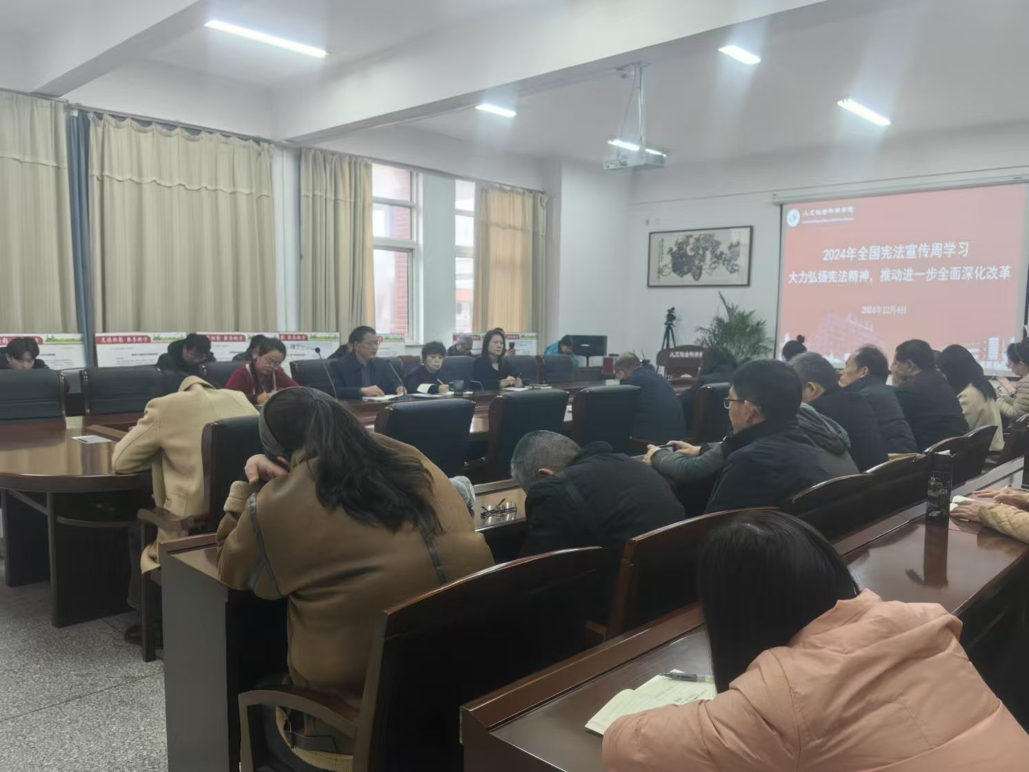 12月4日下午,PA视讯官方网站在仁和楼A304会议室召开2024年全国宪法宣传周专题学习会。会议由公司党总支副书记姚爱华主持,公司教职工参加会议。