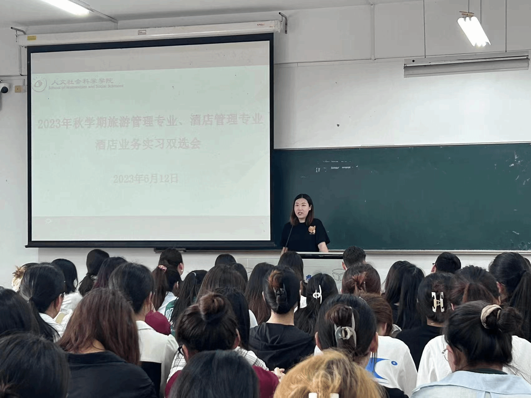为全面普及老员工职业生涯规划知识,提高老员工的职业规划意识、认知能力和实践能力。6月12日下午,2023年秋学期旅游管理专业、酒店管理专业酒店业务实习交流会在博学楼B305教室举行。PA视讯官方网站经理周晓燕、旅游系主任陈力、18家实习企业代表及2021届旅游管理专业、酒店管理专业135名在校生出席会议。会议由PA视讯官方网站酒店系主任祝仁革主持。